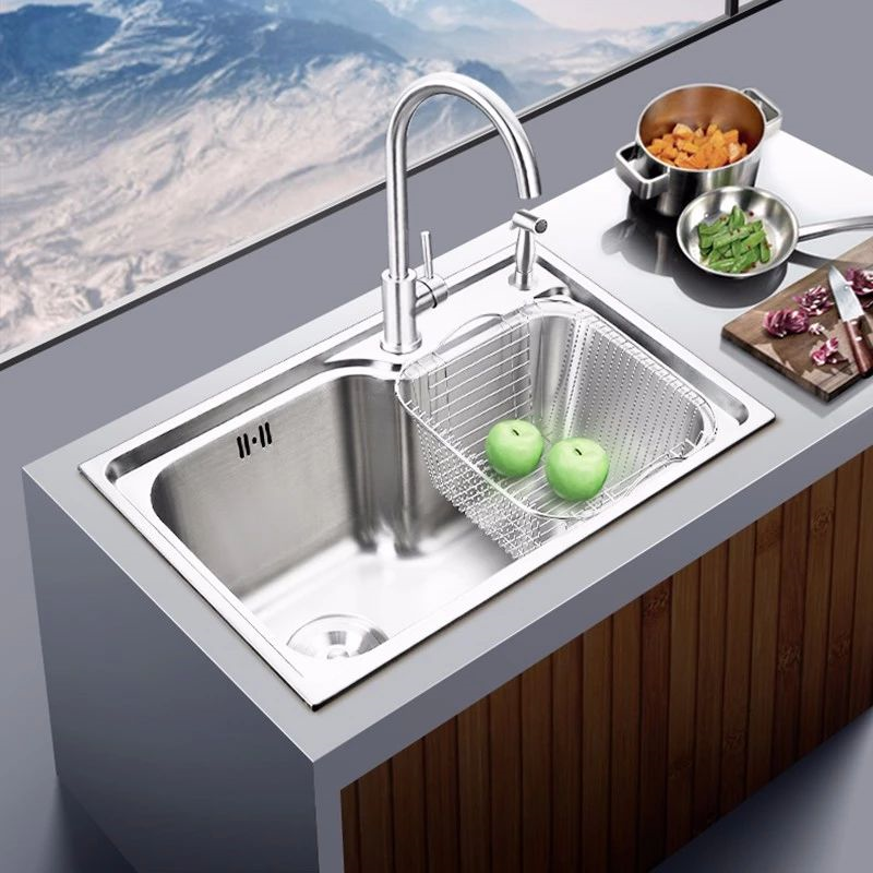 邦克手工單槽不銹鋼水槽使用4毫米加厚面板,可承受更高重量,長期高負重使用也不會變形,而且不銹鋼水槽配備了拉伸龍頭使用時會非常方便,輕輕一拉就可以將水龍頭拉到一旁,接水、清洗變得更加自如,還配備了原裝瀝水籃,洗水果、蔬菜瀝水更快,食物清潔又快又好。水槽內部還有精細納米拉絲,不掛油更易清潔。