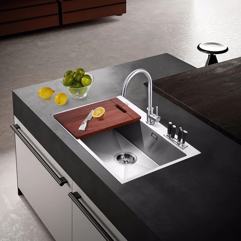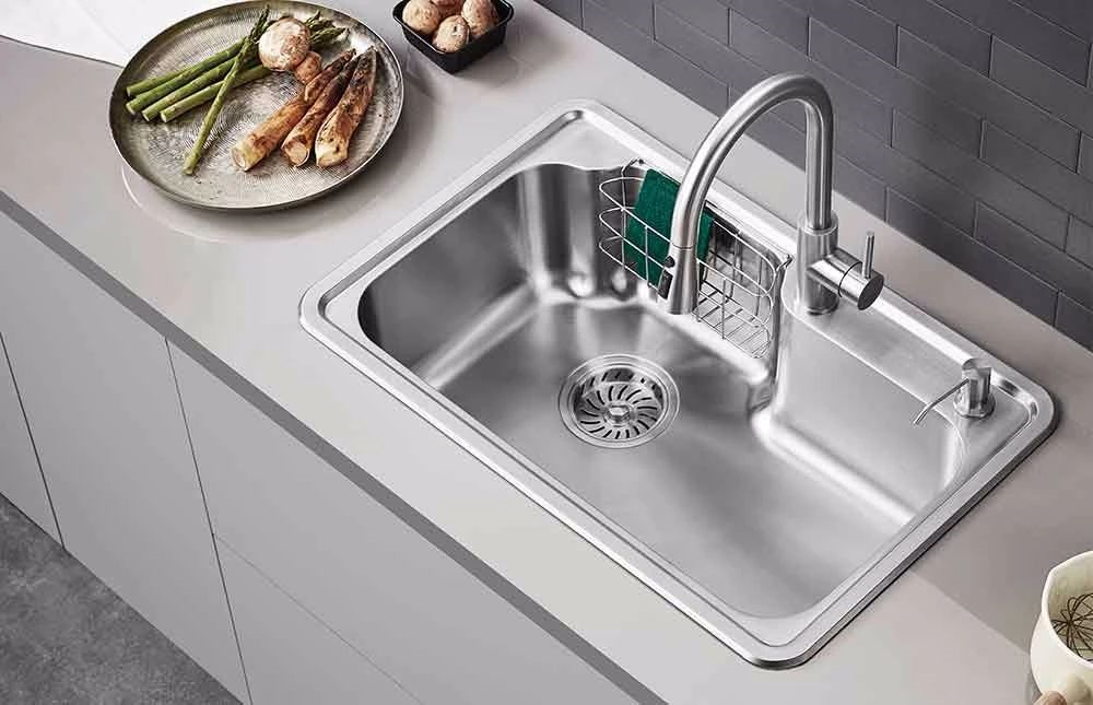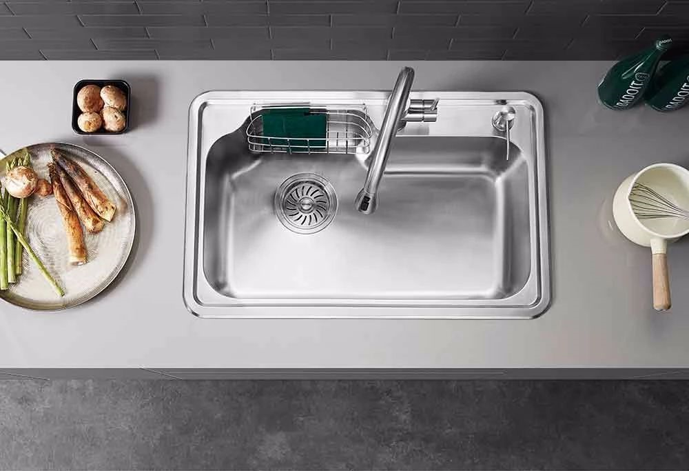 拉伸單槽不銹鋼水槽使用了0.9mm厚的304板材并在1200噸重力的重壓下拉伸成型,一體成型技術讓不銹鋼水槽品質更優,水槽的底部還設有防冷凝涂層,保護櫥柜不受潮,水槽上再也不會凝結水珠了,底部還設有消音墊,打開水龍頭放水也不會有沖擊聲,讓廚房噪音消失,拉伸單槽配備原裝濾水槽,洗菜更方便。