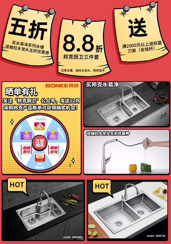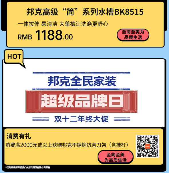 但是想要更好的好生活,沒那么貴! 一個好的不銹鋼水槽經久耐用 卻承載了許多一家人一輩子的記憶 廚房是一個特別重要的地方,我們裝修的每一處都要實用 健康的飲食習慣不僅僅是一種深耕文化 更是一種生活方式的體現,生活態度的踐行 別看水槽在廚房占不到1㎡ 要是選不對,每天做飯多痛苦半小時 要是選對了,可以愛上洗碗,連洗碗機都不需要了! 廚房和生活不可將就,一起下廚是幸福的開端 在考慮美觀、耐用、環保等因素時 健康與干凈在廚房是缺一不可的生活方式 井然有序是精致生活的高效訣竅 邦克廚衛是萬千家庭的走心之選