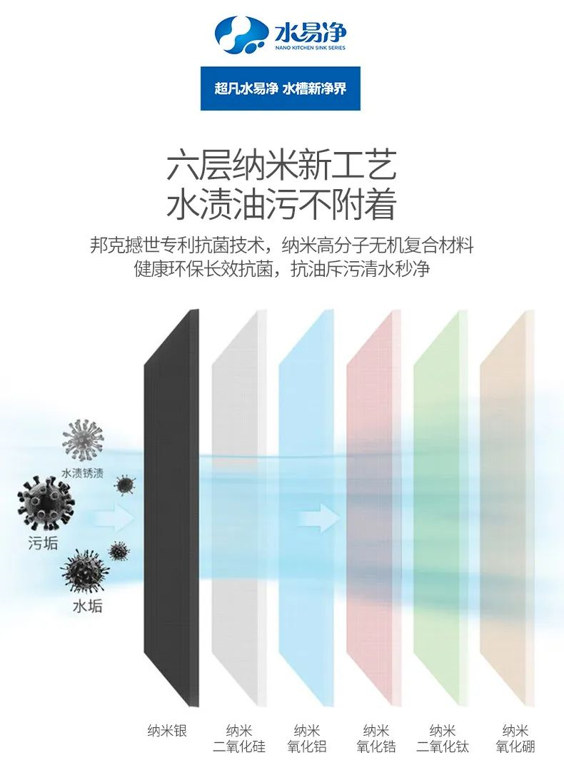 邦克自潔凈水槽采用自主研發并獲得專利的納米親水技術,主要原理為在食品級304不銹鋼水槽表面覆蓋六層納米高分子無機復合新材料,其具有極佳的親水性能,當水接觸槽面后呈灘狀,迅速滲入涂層與油污的縫隙,油污浮起被水沖走,不會有任何殘留,達到抑菌抗菌的效果。