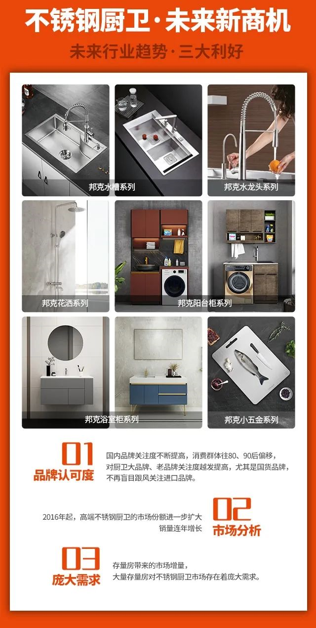 與此同時,科技與時代擦出的火花在各個領(lǐng)域都引起一片火熱,廚衛(wèi)五金領(lǐng)域同樣如此。不管是大建材還是小五金,在科技與智能的賦能之下,萬物互聯(lián)的今天,作為廚衛(wèi)行業(yè)領(lǐng)軍品牌的邦克廚衛(wèi)發(fā)展勢頭迅猛。為進(jìn)一步搶灘市場,完善品牌布局,邦克廚衛(wèi)現(xiàn)面向全國火熱招商。