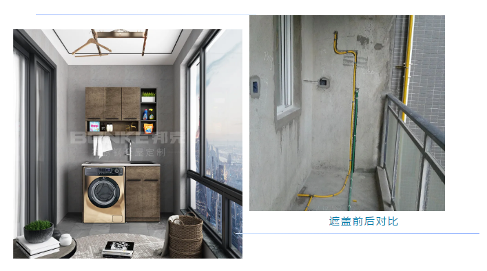 陽臺上常有一些外露的水電管道,定制一套陽臺柜還能將管道遮蓋起來,減少陽臺的雜亂感,養眼又舒心。