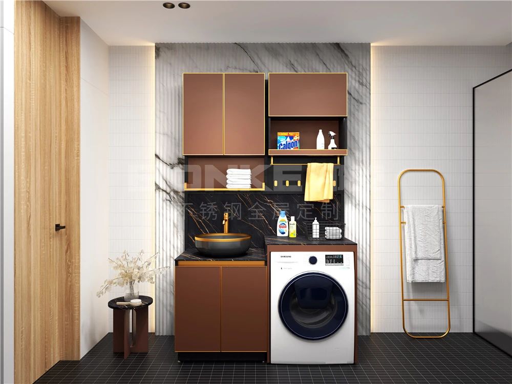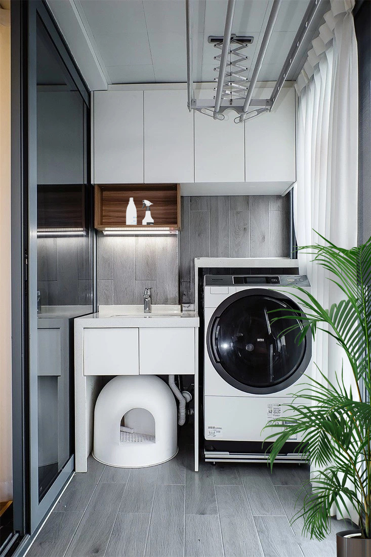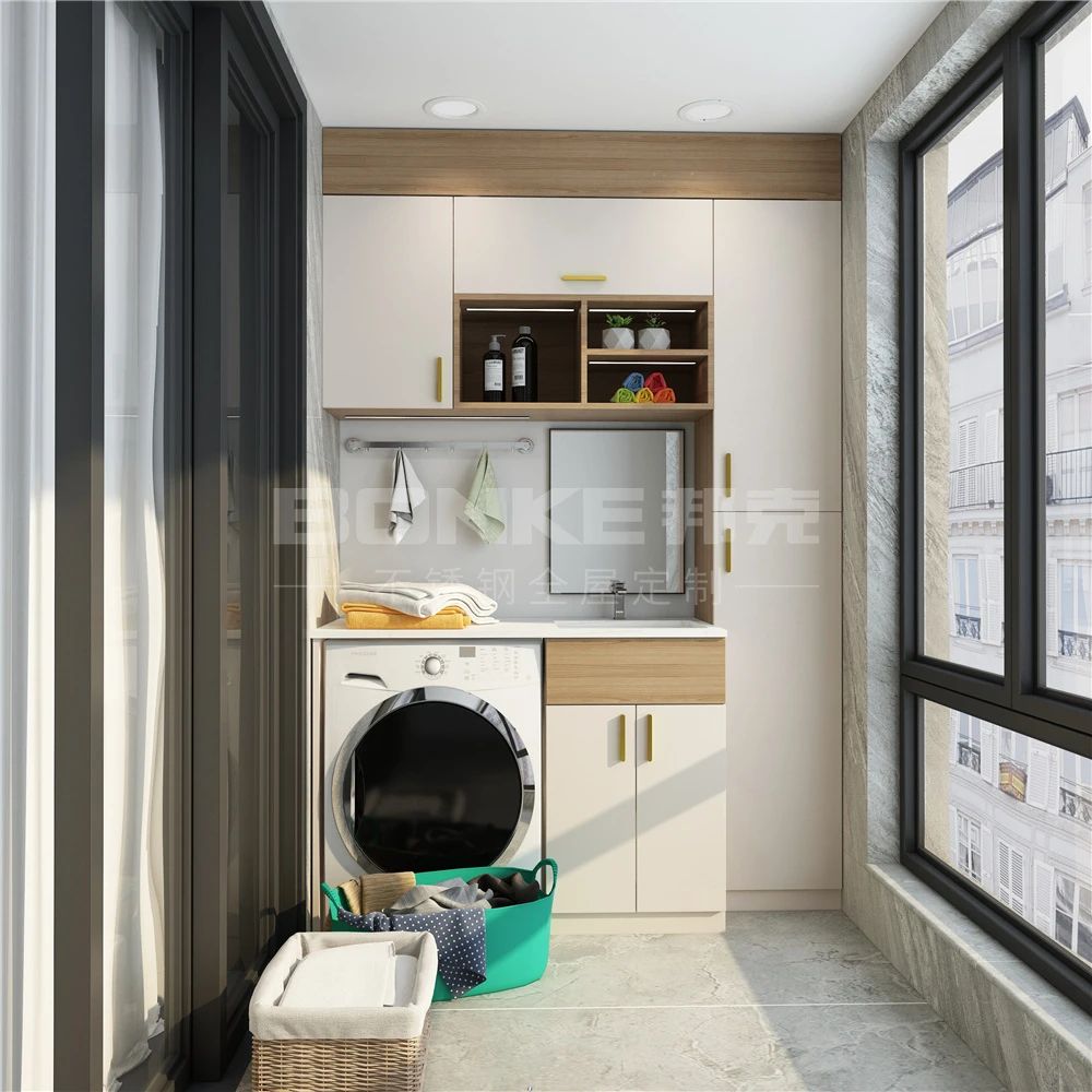 想讓陽臺夠實用,把陽臺打造成洗衣房是個不錯的選擇,預留出洗衣機+烘干機的位置,同時留出手洗水槽,滿足機洗手洗雙重功能,其余部分做滿柜子,能節省下來一個洗衣間,洗曬一次搞定,還能把一些衣物掛在這里,便于翻找拿取,不銹鋼的特質防水防潮,無懼風吹日曬。
