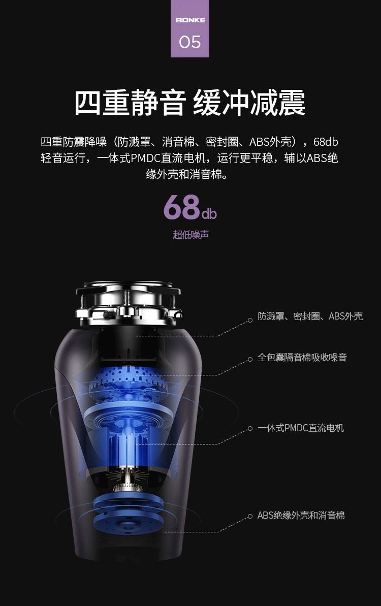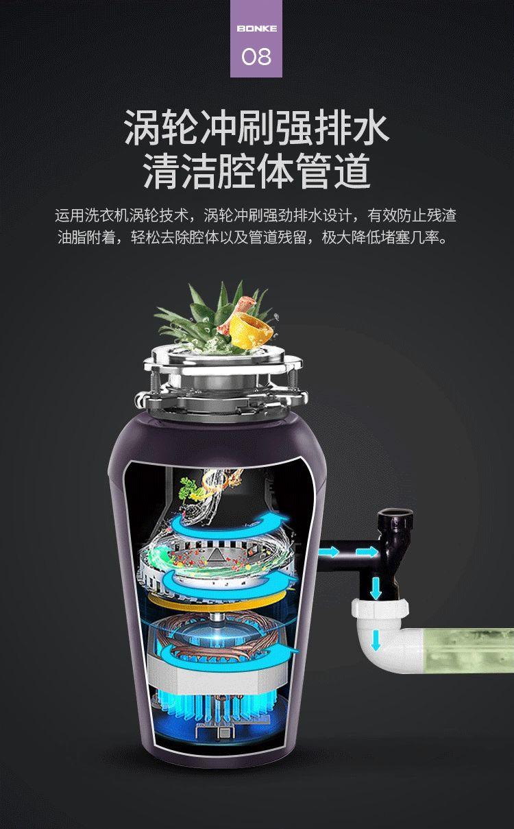 邦克廚余垃圾處理器擁有七級精細研磨技術(shù),讓垃圾像水一樣流走,獨有的7級研磨盤和刀壁不僅能夠?qū)Ω兑话愕墓瞎ぁ⒉巳~、剩飯,還能將排骨、雞骨等硬物輕松變成細狀、糊狀或者顆粒狀,可以算的上“軟硬通吃”了。
