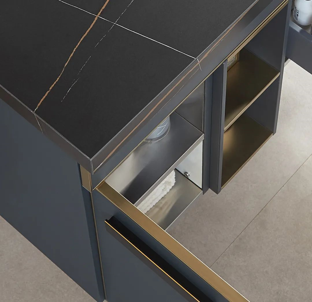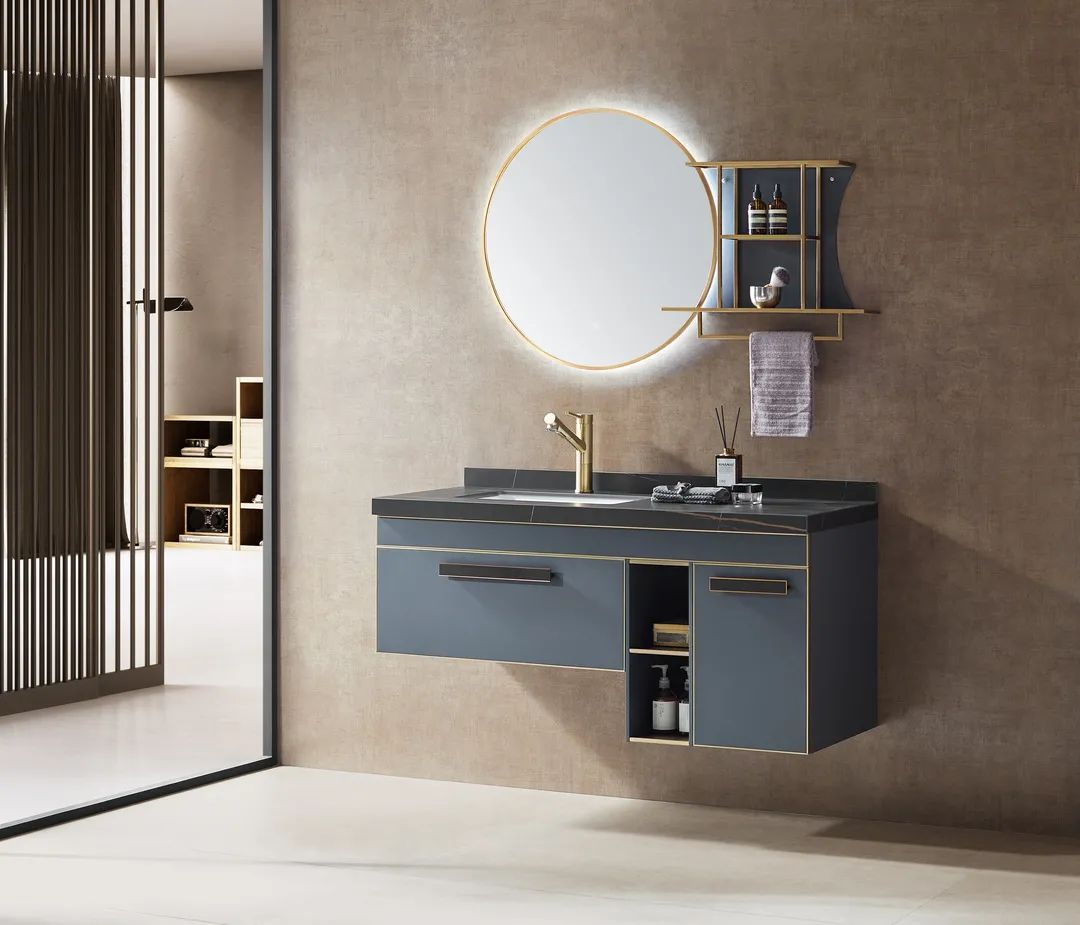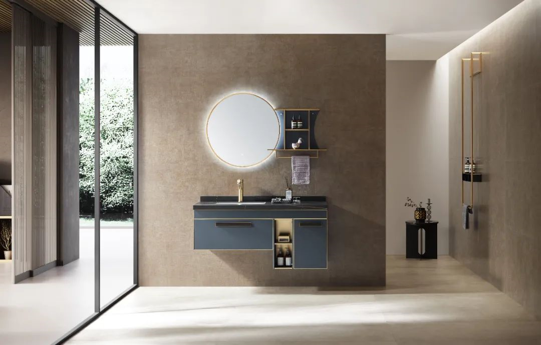 采用輕奢金色的鐵藝架子搭配智能鏡子,