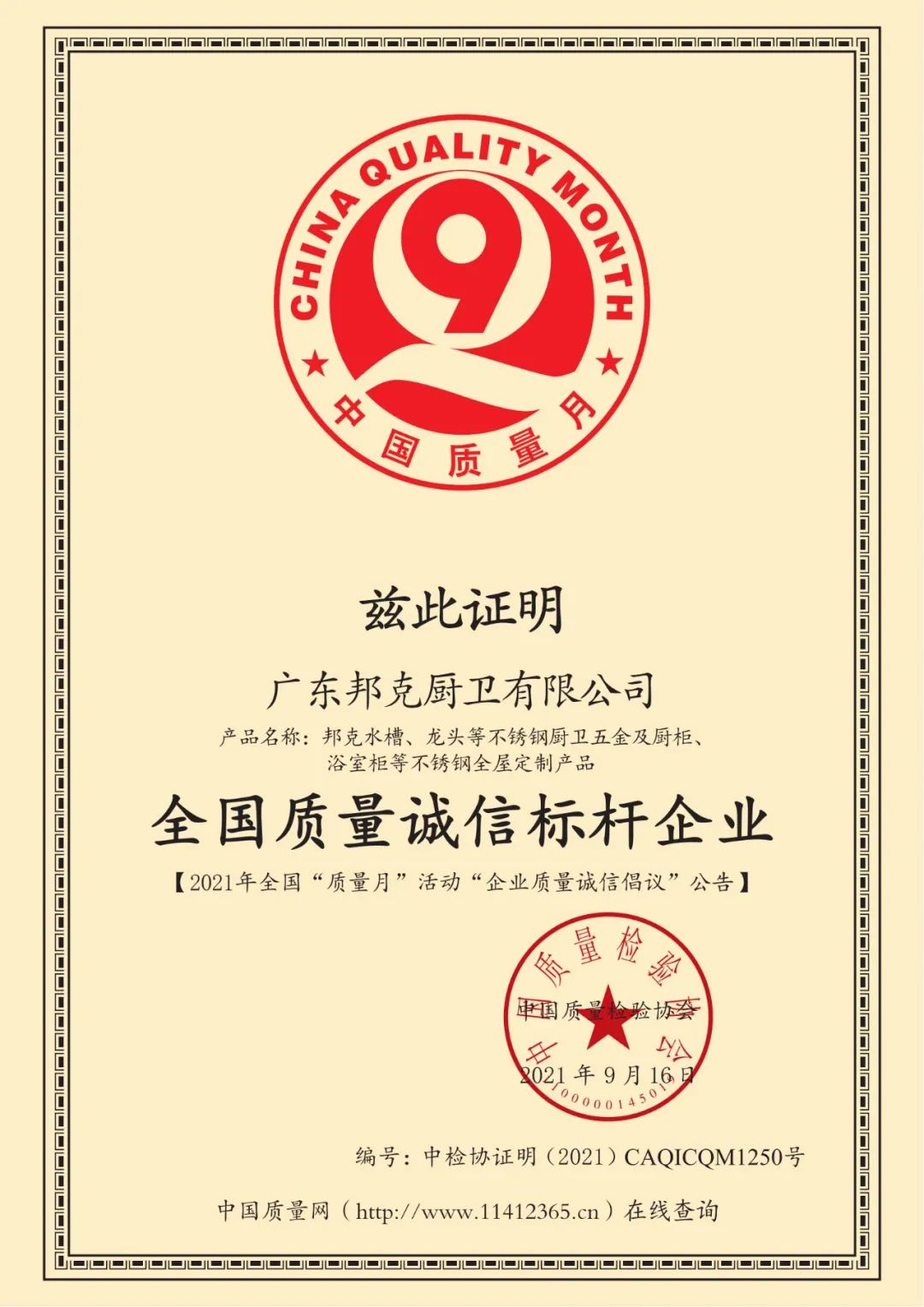 中國“質(zhì)量月”活動擁有悠久的歷史,自1978年開始,每年的9月,中國質(zhì)量檢驗協(xié)會都在全國范圍內(nèi)推介一批重質(zhì)量、講誠信的質(zhì)量誠信標桿企業(yè)和質(zhì)量提升典型企業(yè),為消費者選購產(chǎn)品提供公正、科學、權(quán)威的指導,在中國家居建材行業(yè)具有非常強的權(quán)威性和公信力。因此,邦克廚衛(wèi)能夠連續(xù)多次獲得中國質(zhì)量檢驗協(xié)會頒發(fā)的質(zhì)量檢驗誠信證書,可以說是對邦克廚衛(wèi)產(chǎn)品和實力的認可,充分展示了邦克廚衛(wèi)在中國家居建材行業(yè)的影響力和優(yōu)秀的產(chǎn)品實力。