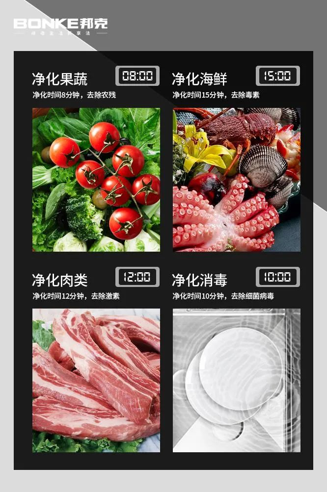 邦克水觸媒智能凈化水槽,集水槽與凈化機于一體,運用獨創的水觸媒凈化技術,輕松高效去除農害殘留,殺滅生鮮食材表面的細菌、病毒等微生物,嚴把健康關。據國際權威機構ITS檢測報告顯示,邦克水觸媒智能凈化水槽對果蔬農藥殘留降解率達96.6%深度凈化。