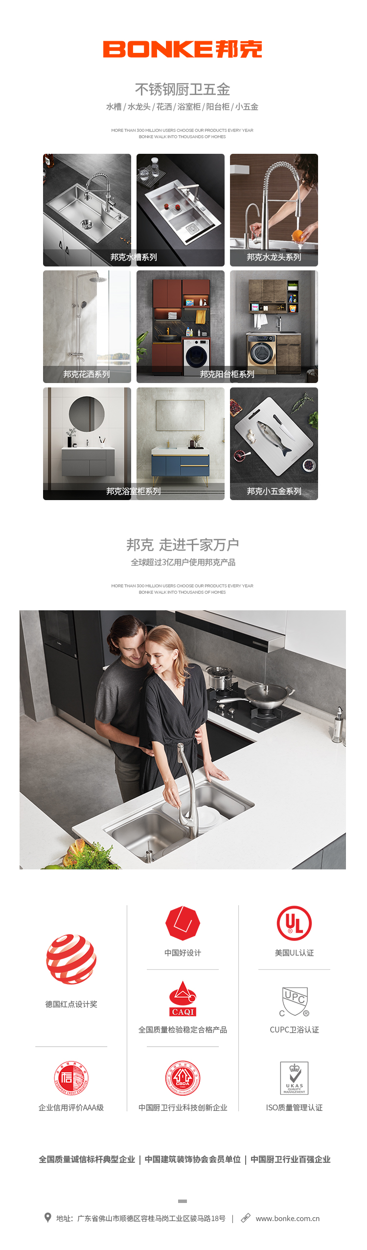 作為中國廚衛(wèi)業(yè)百強企業(yè),邦克的硬實力毋庸置疑。自1997年起,邦克便開始專業(yè)從事不銹鋼廚衛(wèi)五金產(chǎn)品的研制。 經(jīng)過25年的深耕,邦克公司已發(fā)展成集不銹鋼全屋定制家居、廚衛(wèi)五金等多元化產(chǎn)品為一體的現(xiàn)代化集團企業(yè),連續(xù)多年擔(dān)任“中國建筑裝飾協(xié)會住宅裝飾裝修和部品產(chǎn)業(yè)分會副會長單位”。 邦克公司參與多項國家及行業(yè)標(biāo)準(zhǔn)的制定、修訂,積累了大量實用專利和自主知識產(chǎn)權(quán)。 與清華大學(xué)美術(shù)學(xué)院等多家高等學(xué)府及工業(yè)設(shè)計機構(gòu)深入合作并榮獲“紅點獎”、“中國好設(shè)計獎”等國內(nèi)外設(shè)計獎項。
