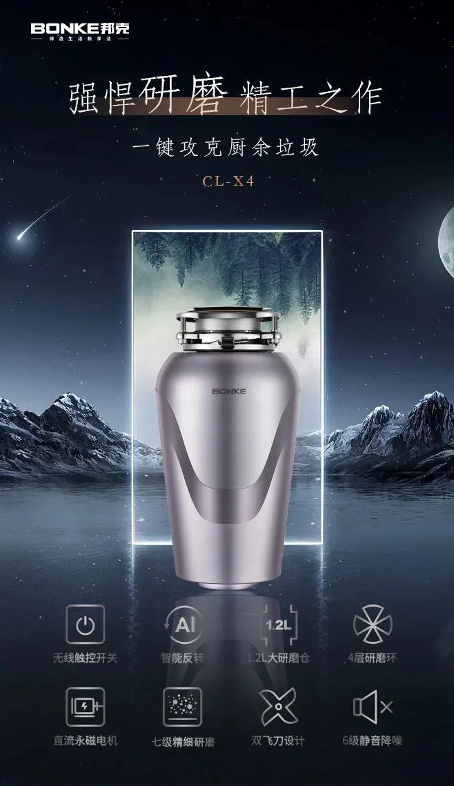 邦克廚余垃圾處理器采用無刀片合金研磨錘研磨技術,獨有的7級研磨盤和刀壁,不僅能夠對付一般的瓜果皮、菜葉、剩飯,還能輕松研磨排骨、雞骨等硬物,落水口和研磨腔植入了新型抗菌技術,拒絕細菌滋生,凈化廚房異味,為廣大消費者打造健康環保、有品質的家居生活。